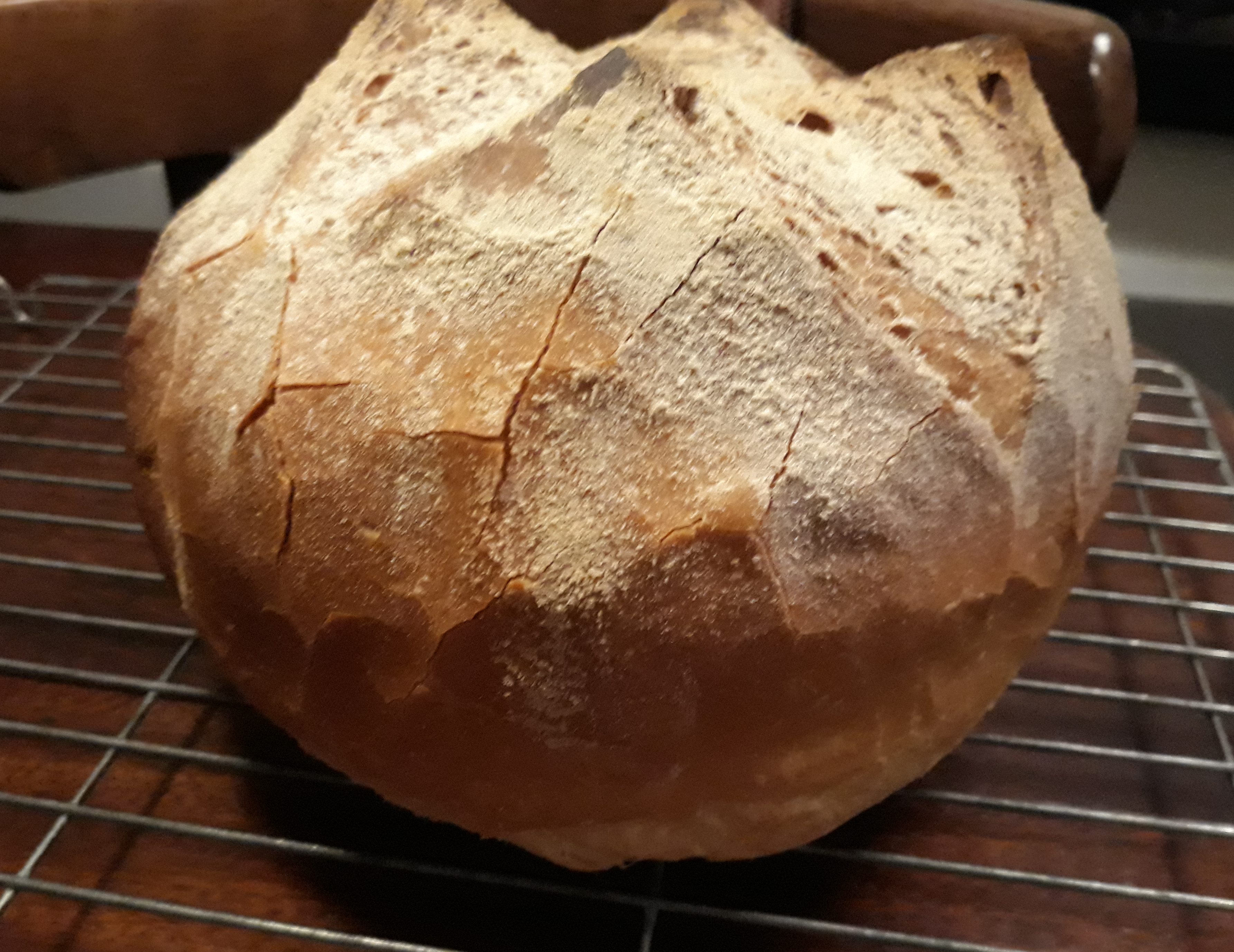 Slash the top of the loaf with a sharp serrated knife to make a cross shape and place in a cold oven. Set the oven to 220°C and once the oven has got up to temperature, bake for 15 minutes. Turn the temperature down to 200°C and bake for a further 15 – 20 minutes, until brown and crusty. Check the loaf is cooked by knocking its underside and listening for a hollow sound. Cool on a rack and listen carefully for the sound of the crusts cracking!