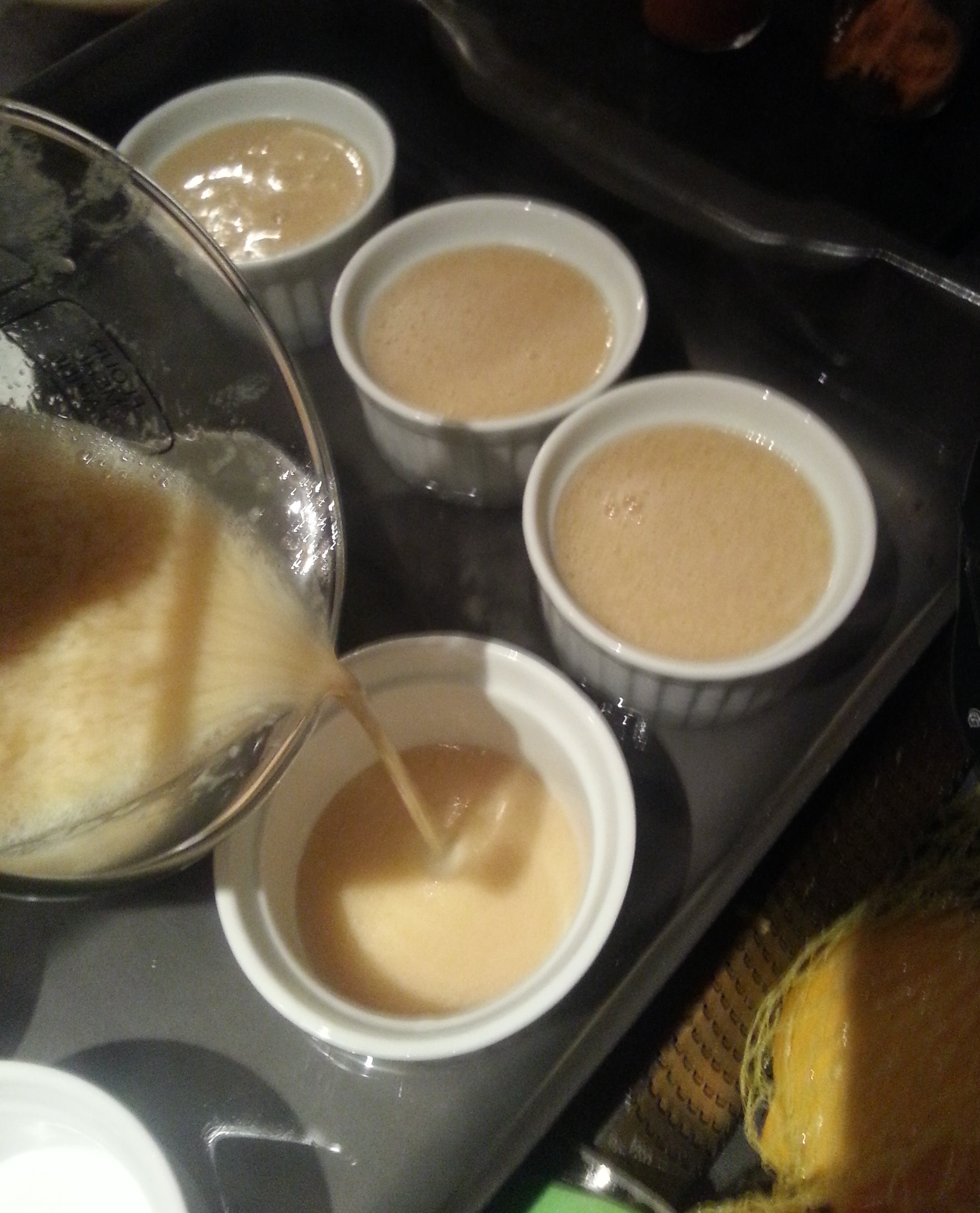 Place your ramekins in a deep roasting tin and pour the custard into them and cover them with foil. Pour boiling water into the tin, technically turning it into a ban Marie. Carefully slide the tin into an oven already preheated to 180⁰C and bake for 12 to 20 minutes, or until the custards are just set and still have a good wobble on them. Serve straight away.