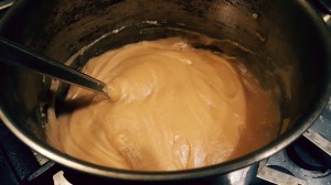 Melt the butter in a saucepan and stir in the flour to make a roux. Cook for 3 or 4 minutes, stirring occasionally until the roux goes a pale brown colour.
