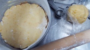 Spoon half of the mixture into your tin and level it off. Take a third of your marzipan and roll it out into a circle the same size as the tin, trimming away any untidy bits. Use a little icing sugar to roll the marzipan out, just like you would use flour to roll out pastry.