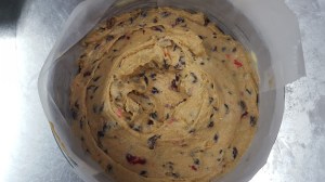 In a large bowl, beat together the softened butter, caster sugar, eggs, flour, cinnamon and zests. Using a hand mixer, beat together until smooth. Now fold in the mixed fruit and cherries with a spatula or wooden spoon.