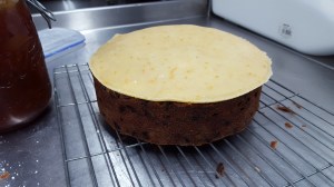 When cold, roll out half of the marzipan in a circle slightly larger than the cake – the best way to do this is to use the outside edge of the tin it was baked in as a template.