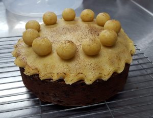 Brush the top of the cake with some apricot jam (if it is very thick, you may want to warm some with a little water in a pan) and lay the marzipan on top, then brush the marzipan with the beaten egg. Divide the remaining marzipan and trimmings into 11 equally-sized balls and arrange them in a circle. Brush those with egg too and glaze the top using a chef’s flame torch (or a very hot grill).