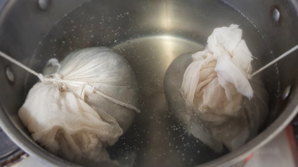 Next day (or next hour) make you puddings. First get a large pot of water on the boil; deep enough for two puddings to cook without touching the base of the pot. Next, cut two pieces of muslin (cheesecloth) into rectangles of around 30 x 60 cm, place in a bowl and pour boiling water over them. When cool enough to handle, remove one and squeeze out excess water. Fold it in half to make a square shape, then lay it in a bowl.