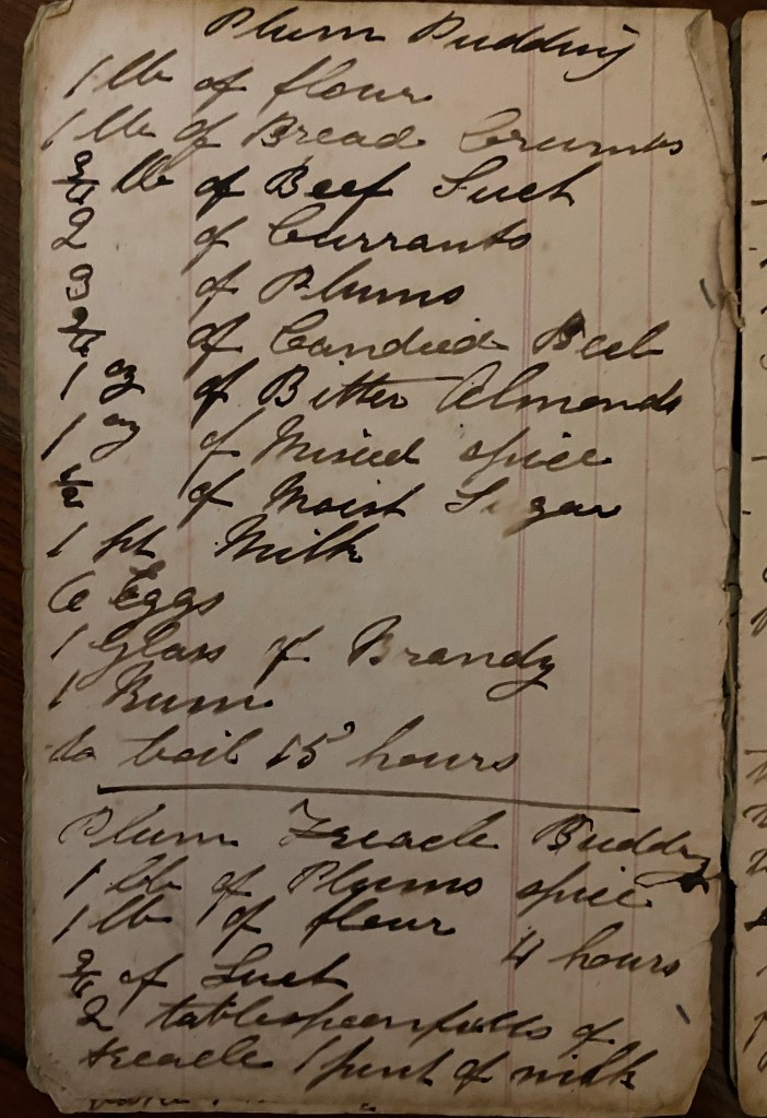 I love Christmas pudding, but whenever I’ve made my own (I have used Delia Smith’s and Jane Grigson’s recipes in the past) I’ve always been rather disappointed. I reached out to Twitter for inspiration and food historian (and podcast alumnus) Sam Bilton very kindly let me use her Great Aunt Eliza’s recipe taken from her handwritten recipe book. Sam has cooked it for a demonstration at Petworth House, West Sussex.3 Click here to find out more about Sam’s Great Aunt, and how she adapted and recreated the recipe. Here’s the original: