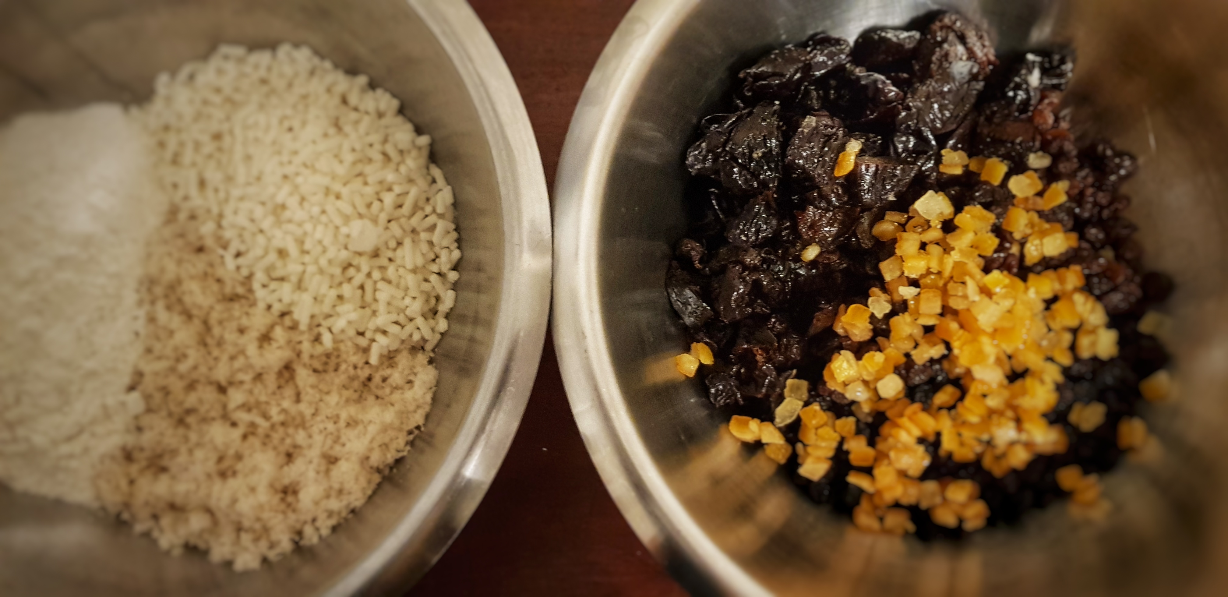 I hedged my bets on the plums and used half prunes and half raisins, and swapped out almond extract for the bitter almonds. Feel free to toss in some slivered almonds for texture though.