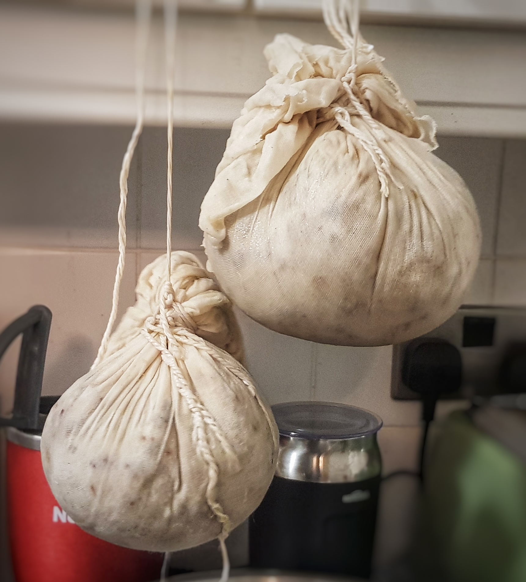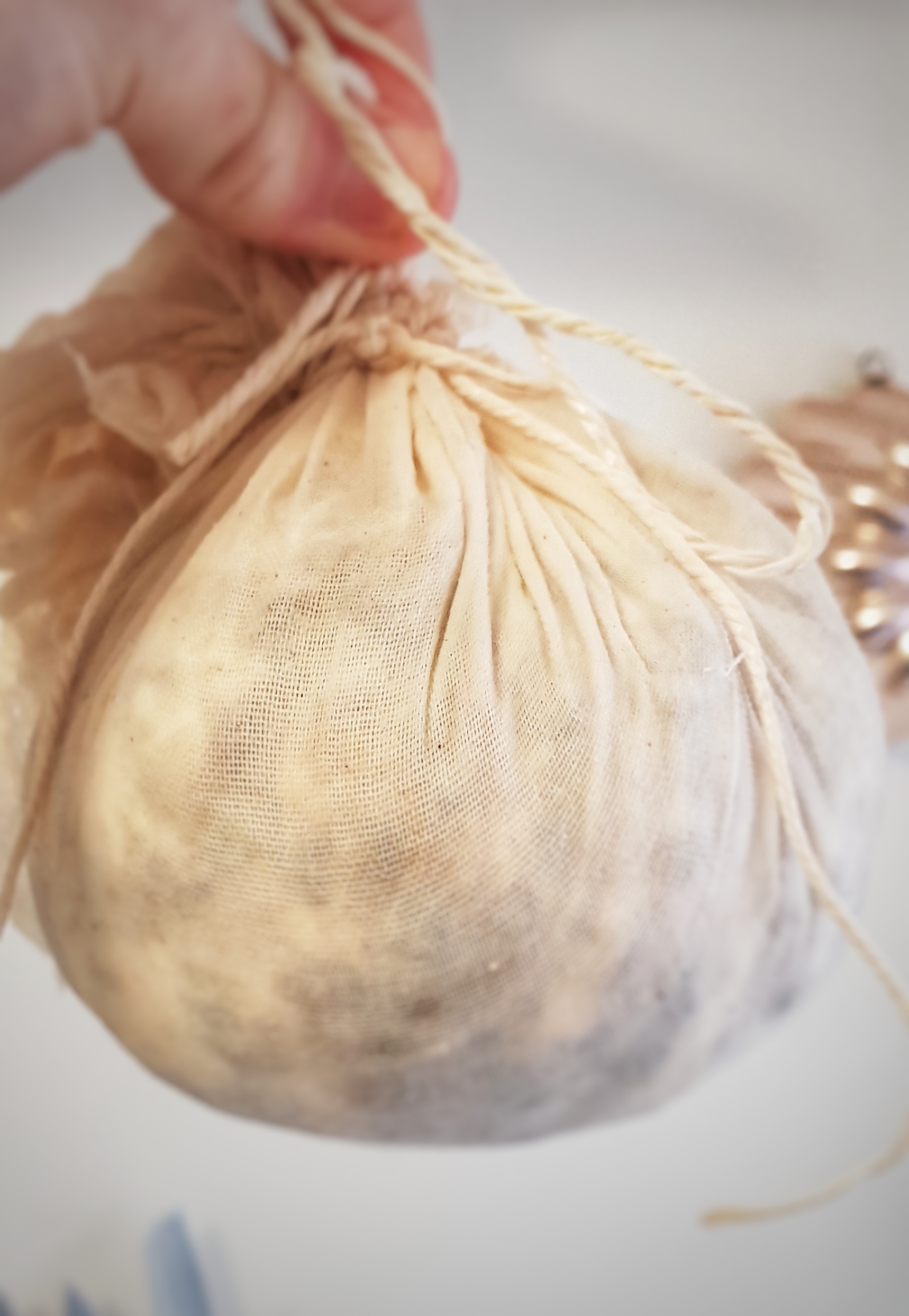 Next day (or next hour) make you puddings. First get a large pot of water on the boil; deep enough for two puddings to cook without touching the base of the pot. Next, cut two pieces of muslin (cheesecloth) into rectangles of around 30 x 60 cm, place in a bowl and pour boiling water over them. When cool enough to handle, remove one and squeeze out excess water. Fold it in half to make a square shape, then lay it in a bowl.