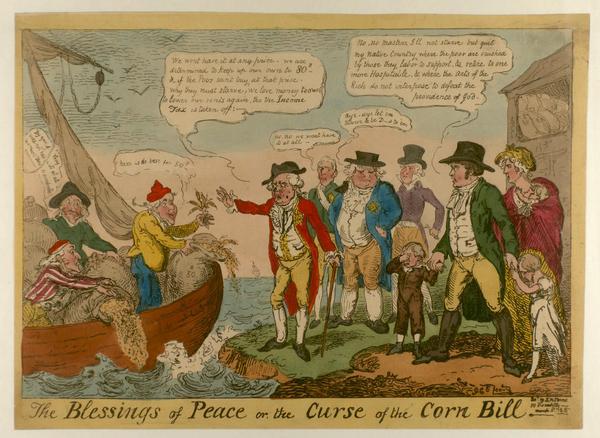 A Cruikshank cartoon from 1815 showing the English turning away cheap foreign corn whilst the poor starve
