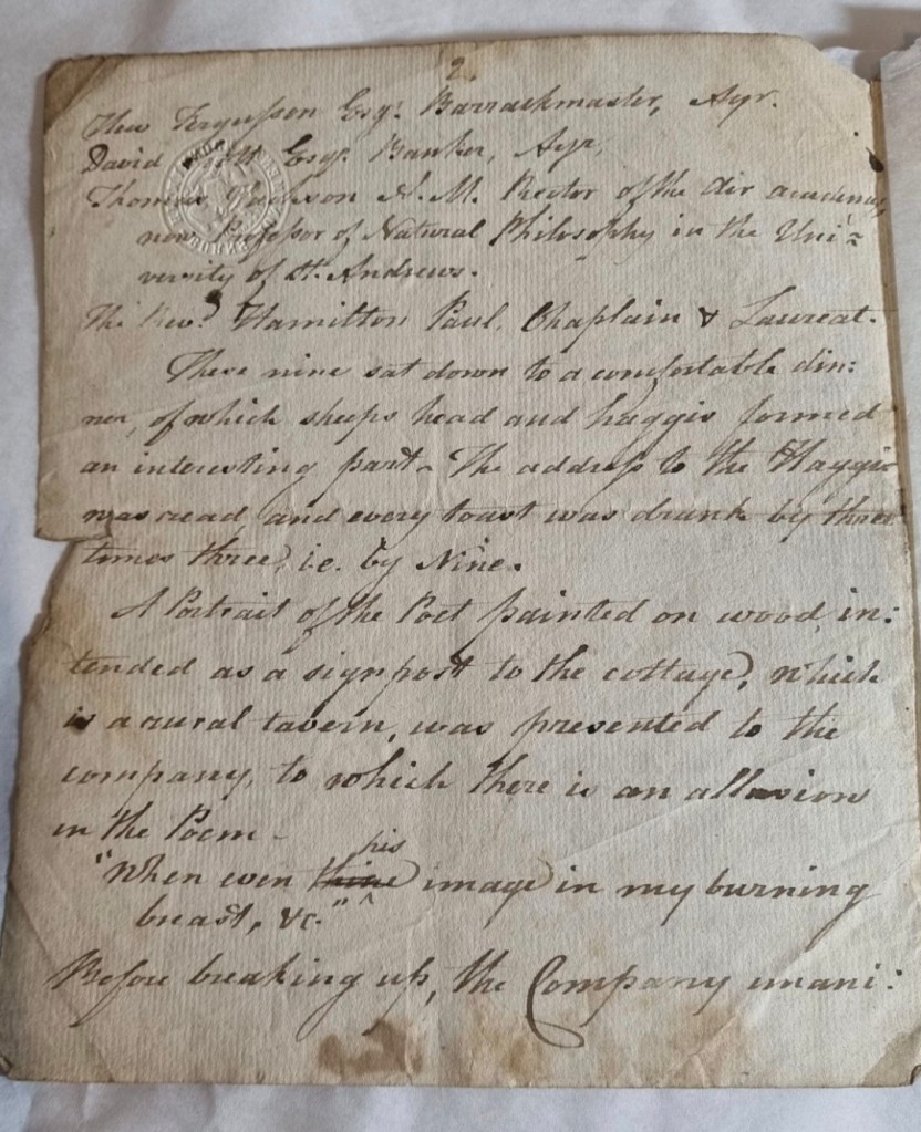 A photo of a manuscript written by Hamilton Paul, recording the first Burns Supper in 1801. From the McKie Collection held by East Ayrshire Museums: https://www.futuremuseum.co.uk/collections/people/key-people/burns/manuscripts/anniversaries-of-burns