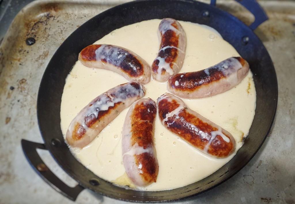 I used my 10-inch Netherton Foundry Prospector Pan throughout because it can be used on the hob and in the oven. It’s also round, which makes portioning much easier when it comes to serving time. The amounts given for the batter are the same as for my Yorkshire pudding recipe, so you could make the toad-in-the-hole in a rectangular tray or even a sturdy cake tin. Colour the sausages in a frying pan first and then transfer them to your chosen receptacle!