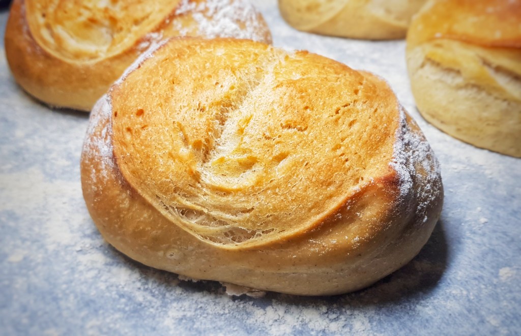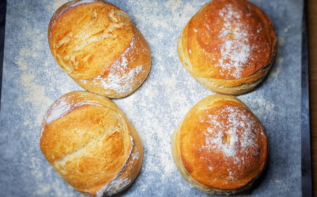 When ready, remove from the oven and immediately brush with more milk and then throw a double layer of clean tea towels over them and allow to cool.