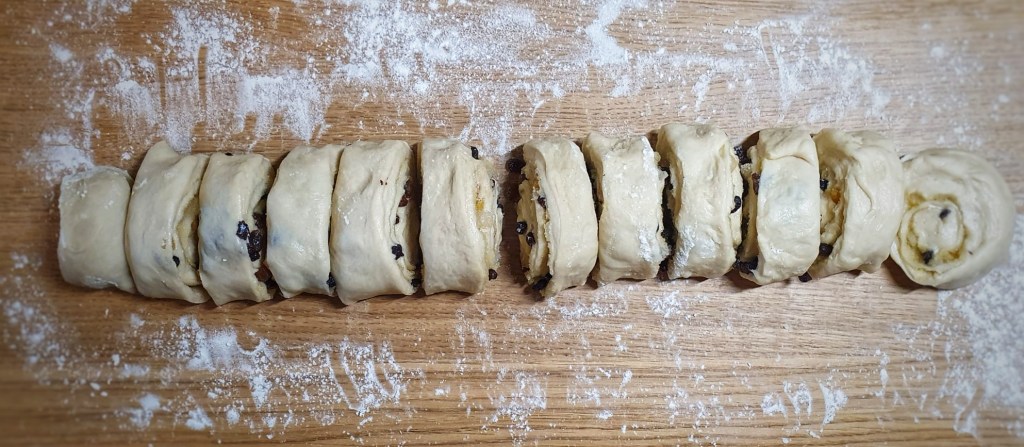 Knead the dried fruit into the dough, then divide into 12 (for precision weigh the dough), then line a baking tray with greaseproof paper.