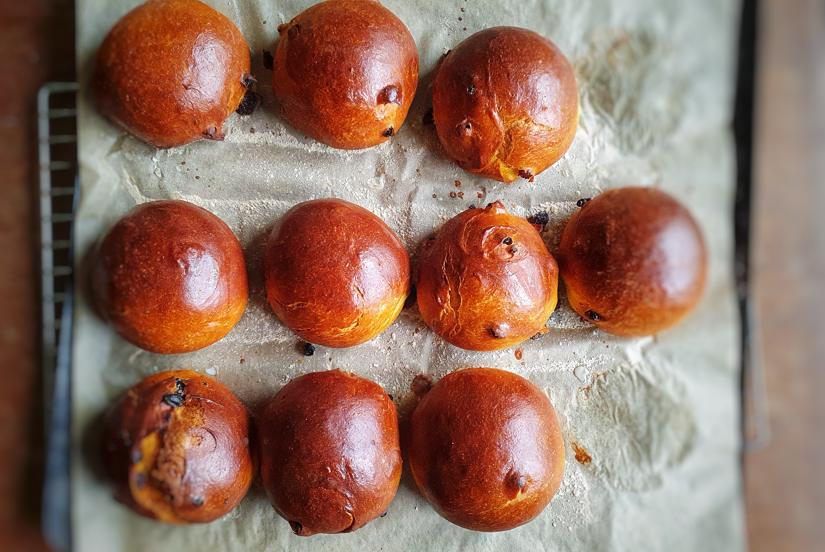 Knead the dried fruit into the dough, then divide into 12 (for precision weigh the dough), then line a baking tray with greaseproof paper.