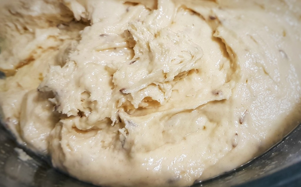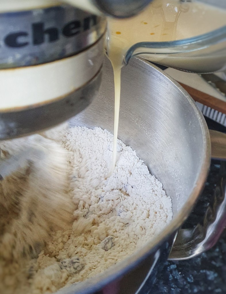 2. Once proved, add the butter and sugar. It’s very common, even in modern recipes, to add the enriching ingredients after the first prove. Ingredients such as these get in the way of entangling gluten strands, and their heaviness slow proving even further. These days however with our robust fast-action yeasts, I find dough rises well with all of the ingredients mixed right from the start – though I hedge my bets a little by using a mix of plain and strong white flours.