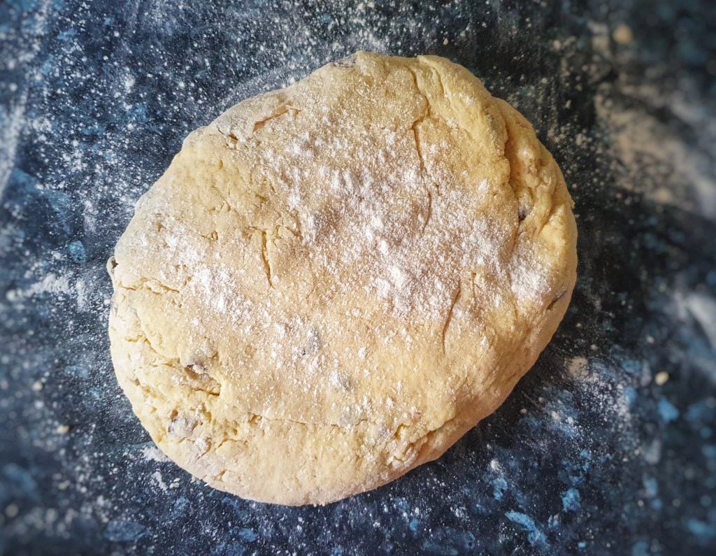 Make a well in the centre, add most of the milk and mix to make a nice soft dough – it’s a good idea to use the old-fashioned method of combining everything using a cutting motion with a butter knife; that way you ensure the liquid is combined with the other ingredients without overworking the gluten in the flour. Add the remaining milk should there be any dry patches.