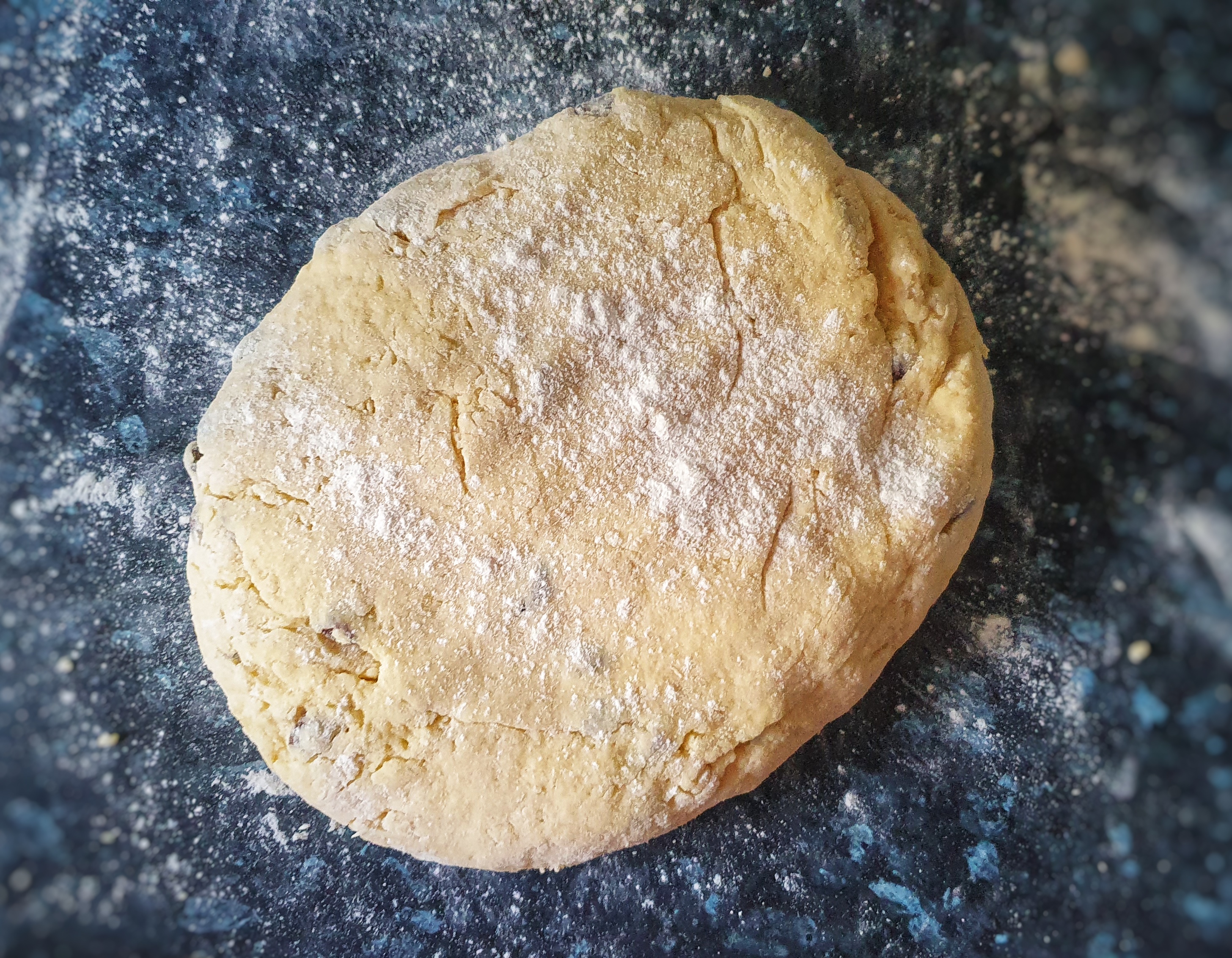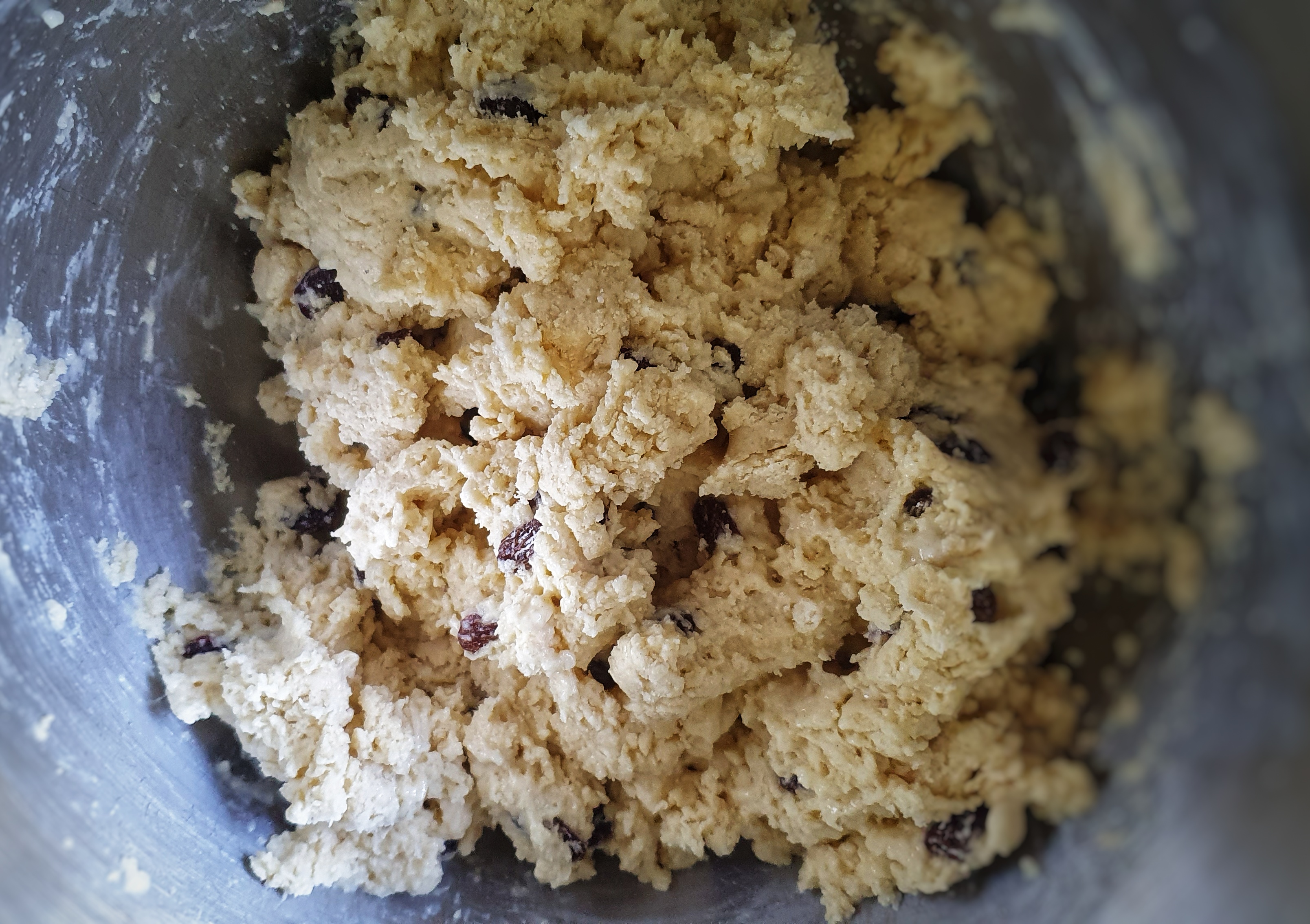 Make a well in the centre, add most of the milk and mix to make a nice soft dough – it’s a good idea to use the old-fashioned method of combining everything using a cutting motion with a butter knife; that way you ensure the liquid is combined with the other ingredients without overworking the gluten in the flour. Add the remaining milk should there be any dry patches.