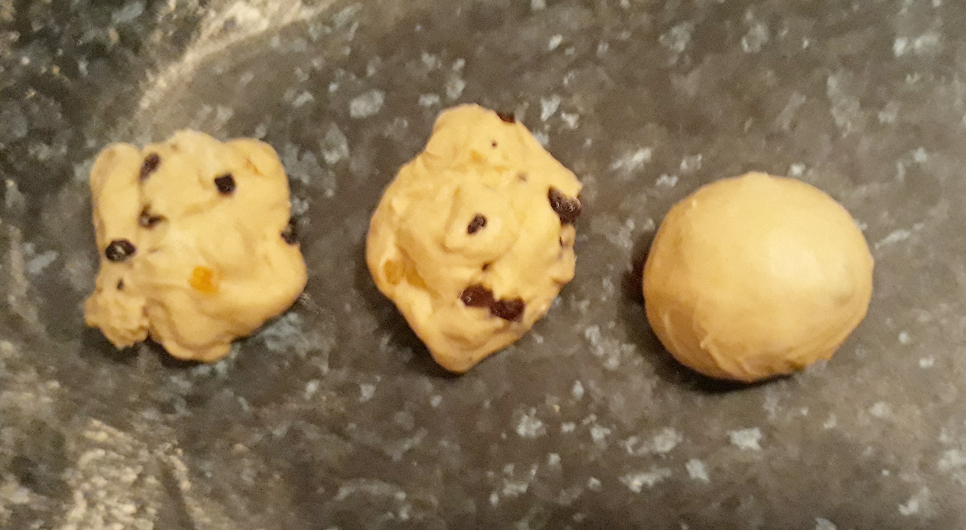Knock back the dough to remove any air and mix in the dried and candied fruits – again, either by using your hands or your dough hook. Divide the dough into 8, 10 or 12 equally sized pieces and roll up into very tight balls on a very lightly-floured board. This is done by cupping your hand over a ball of dough and rolling it in tight circles, takes a little practise, but is an easy technique to learn.