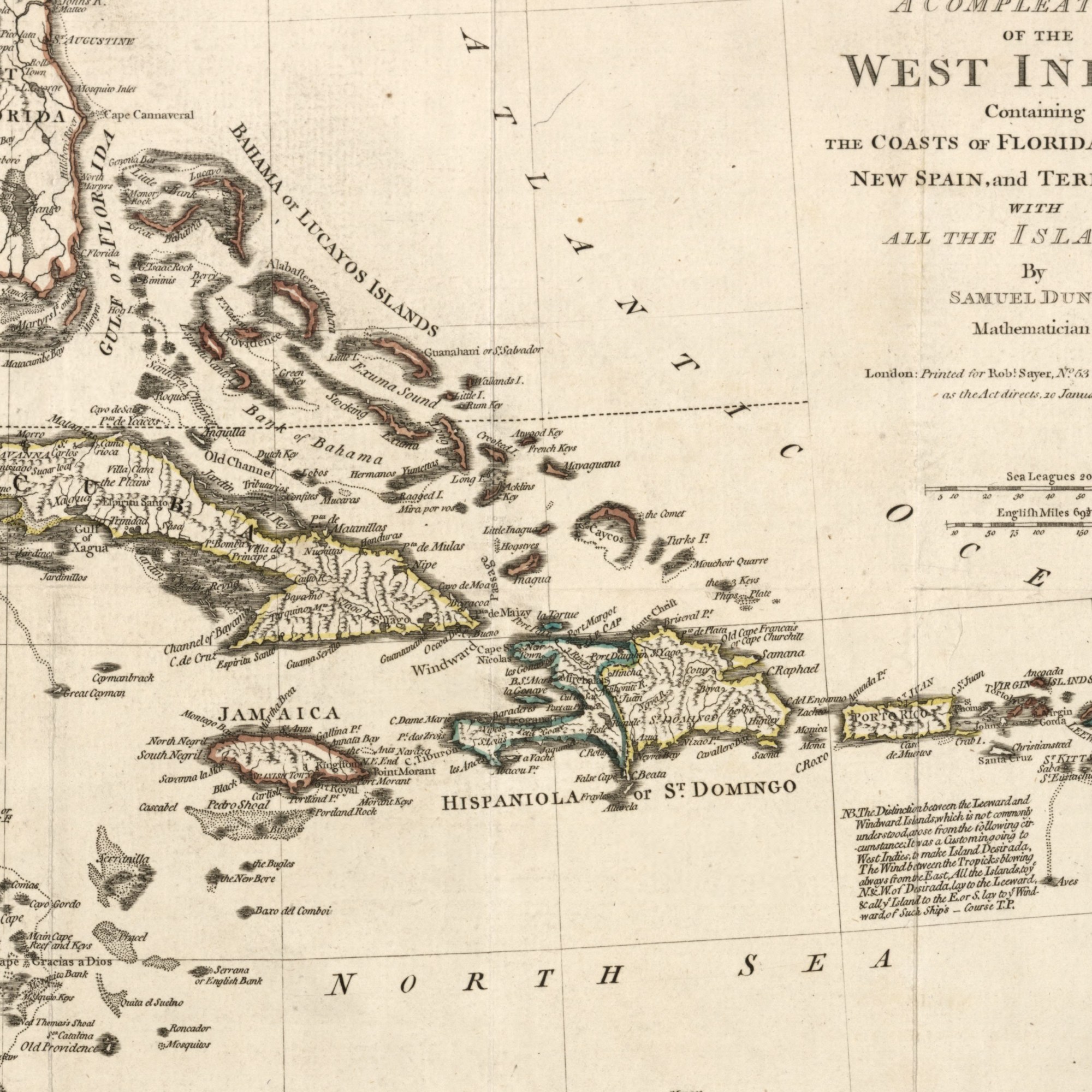 Detail from A compleat map of the West Indies (1774). The tiny islands of the Lesser Antilles are dwarfed by the greater islands, Cuba and Hispaniola.