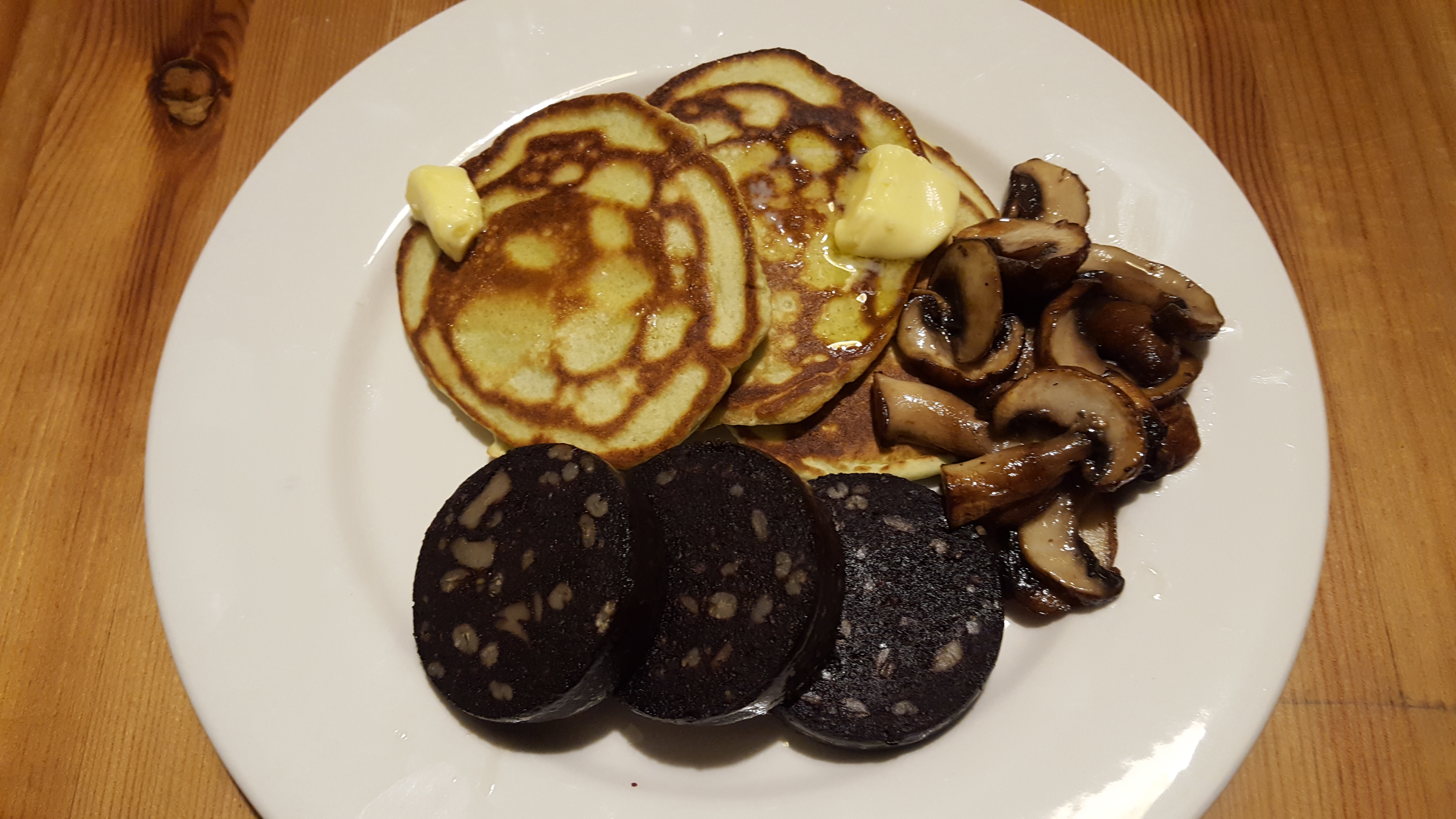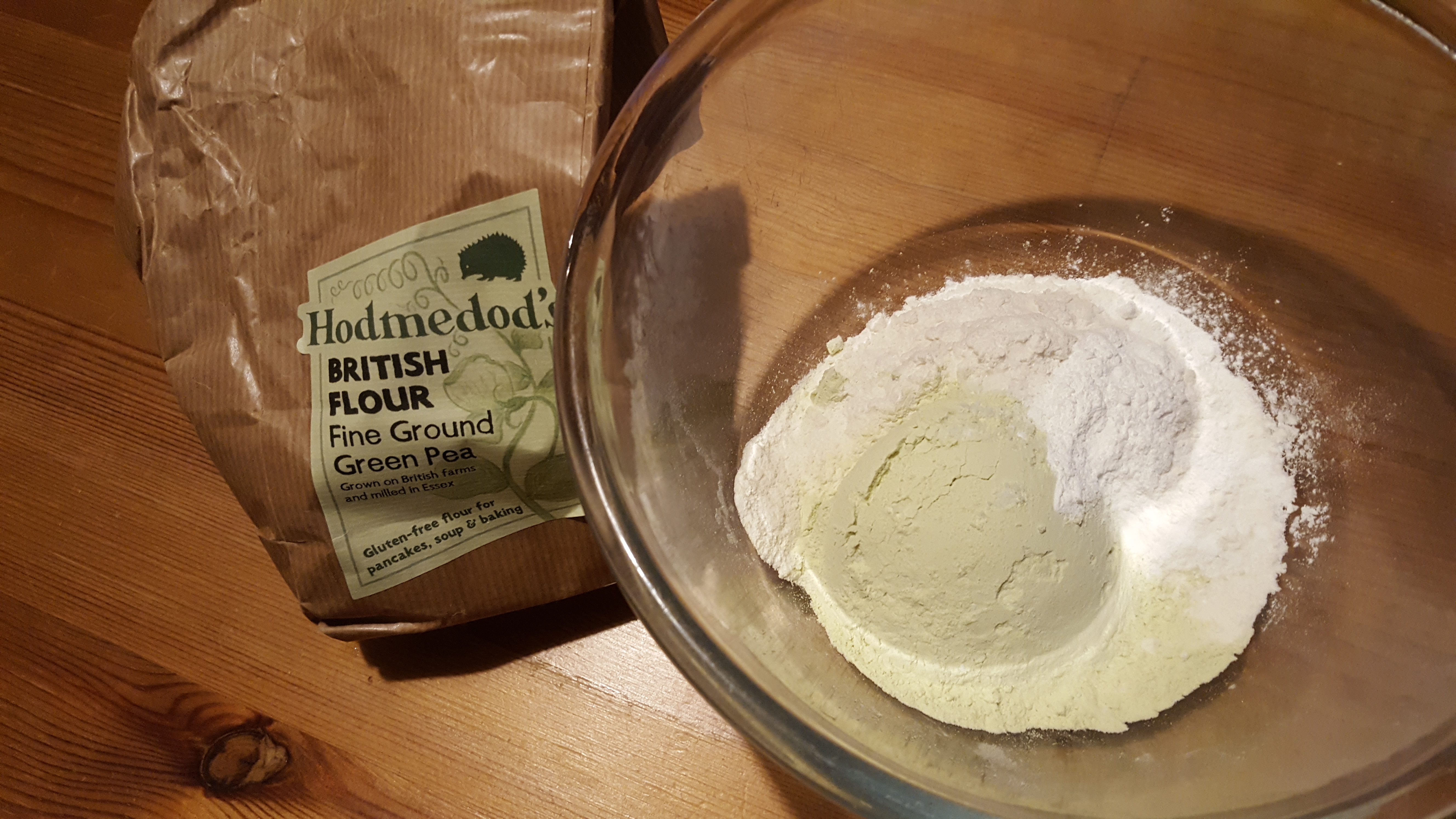 I was having a sort out of the kitchen cupboards and happened upon the bag of pea flour I had bought to write a post on peasebread a while ago. Researching for the post, I found that in the very north of Scotland, people ate a lot of peasemeal until recently, because very little in the way of cereals could be grown up there. These Scottish islanders would make pease pancakes amongst other things, so I thought I might have a go at them myself. Having no recipe, I just adapted my own recipe for American pancakes. They turned out pretty good – much better than the peasebread – and were delicious with some fried mushrooms and black pudding. They had a distinctive fresh pea and roast peanut flavour to them, and were slightly rubbery, but not in an unpleasant way.
