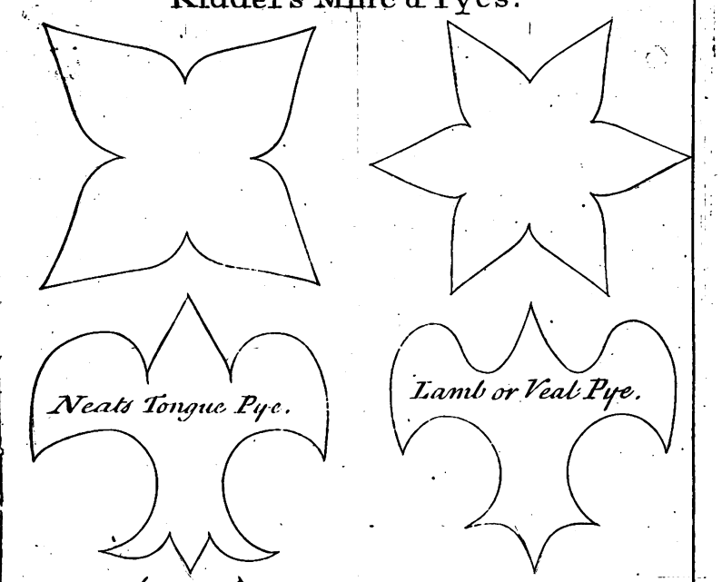 As promised on this year’s Christmas episode of the podcast, all about mince pies, here is my pastry recipe and method for making the shaped-mince pies in E. Kidder’s Receipts of Pastry and Cookery. It was originally published in 1721, but I used the 1740 edition of the book (here’s a link to the document). If you go to the end of the book, you will see lots of different minced pie templates, just like the ones below. The idea was that you rolled out your pastry and cut a shape out, then made pastry walls, filled them with mincemeat, placed on lid on top and baked it. Really beautiful, but fiddly-looking shapes, I’m sure you’ll agree.