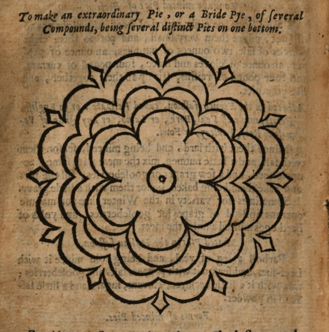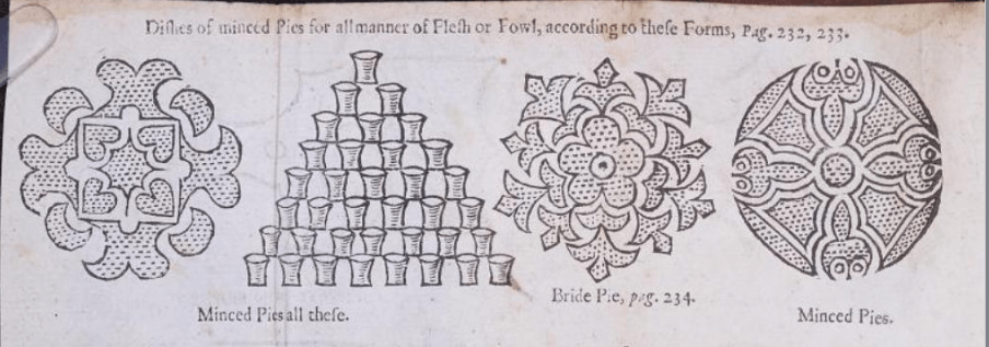 In the Christmas episode, I considered making some of the pie designs in Robert May’s The Accomplisht Cook (first published in 1660), but I found Edward’s designs much easier to extrapolate into three-dimensional pies! However, here are a few from May’s book to give you an idea of the sorts of minced pies he was making: