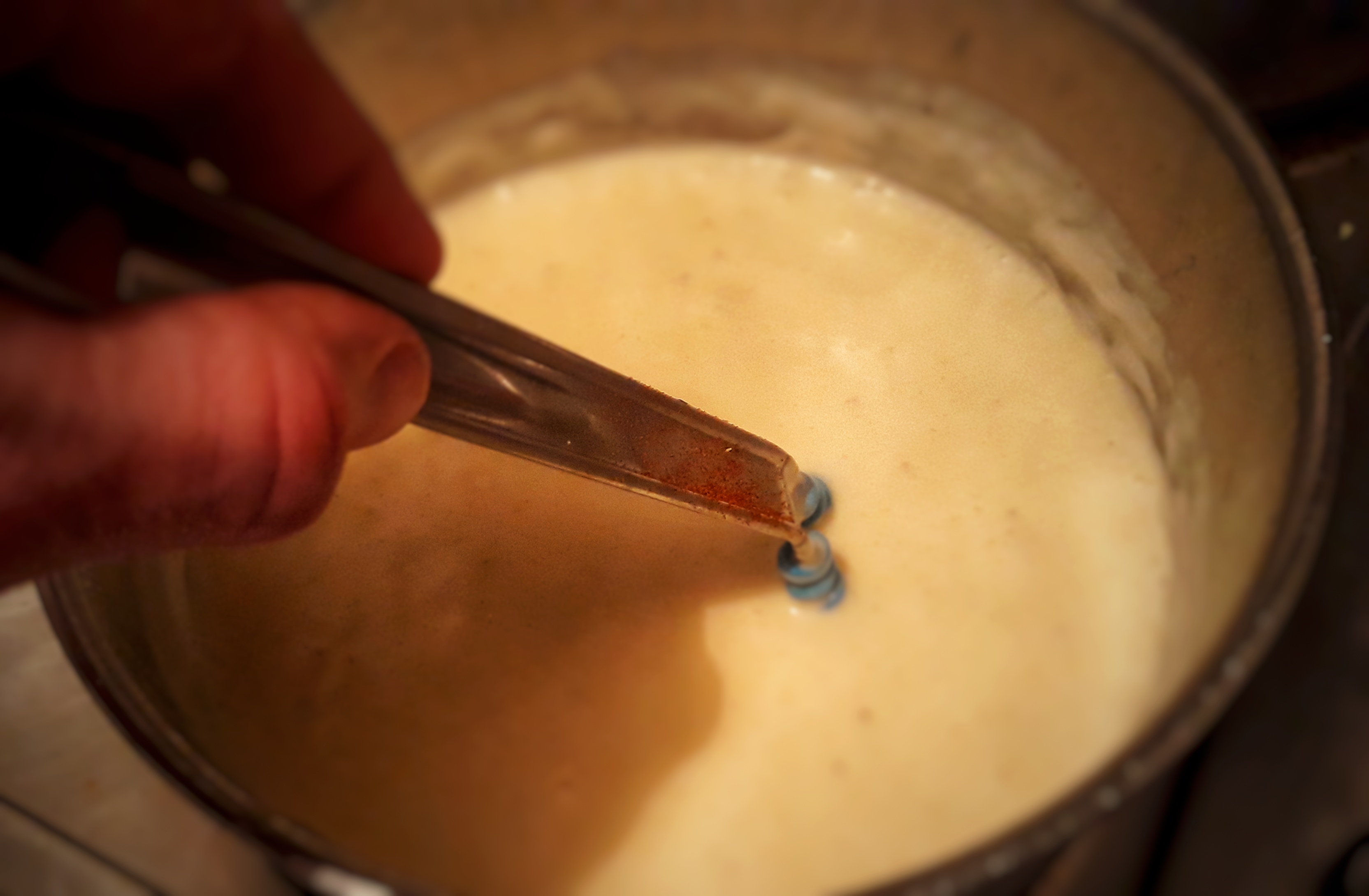 Groats are whole grains of cereals and oats or barley could have been used, but I chose whole wheat. The only change I made was to use a normal shortcrust pastry and make a regular double-crust pie in a tin, rather than a raised crust with a hot water pastry. I regret that a bit now, but I wasn’t as good at pastry then as I am today. It is a good pie – some plainer cooking that married very well with the rich meat.